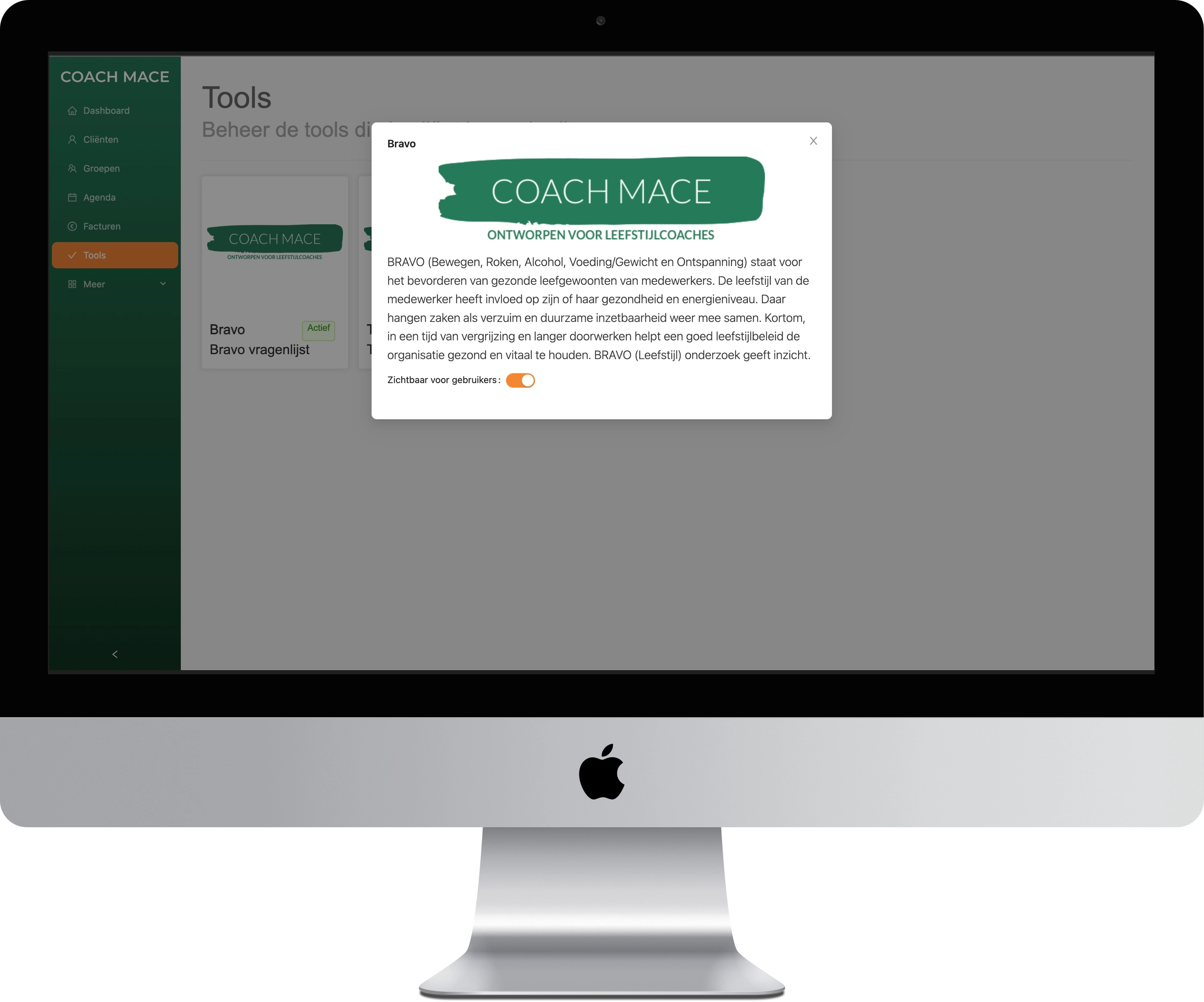 CoachMace vereenvoudigt het werk van een leefstijlcoach. Met CoachMace kunnen leefstijlcoaches zich volledig focussen op hun cliënten en niet overspoeld raken met administratieve werkzaamheden. CoachMace is een all-in-one applicatie voor leefstijlcoaches en digitaliseert klanten administratie, facturatie en belangrijke tools zoals een slaapdagboek of een stressmeter. Daarnaast biedt het de mogelijkheid om vragenlijsten (vooraf) digitaal in te vullen, zoals het intakeformulier of de BRAVO. CoachMace is ontworpen door Leefstijlcoaches voor Leefstijlcoaches en zorgt ervoor dat je in verbinding blijft staan met je cliënten.